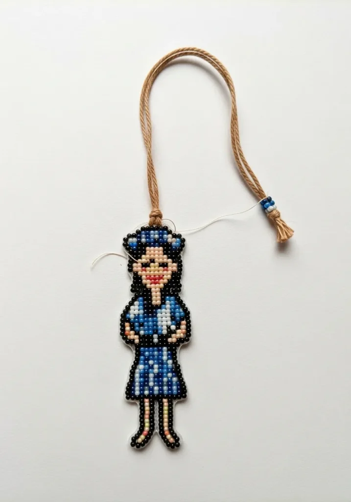 This elegant hand beaded fabric pendant features a sweet doll figure stitched entirely with tiny seed beads in soft blues, black, cream, and blush tones. The design is outlined in darker beads to define the shape, while the dress is filled with patterned blue beads that give it texture and depth. Her rosy cheeks and small red lips add a playful pop of color, and the piece is finished with a simple braided cord hanger accented with a few coordinating beads. The overall look is neat, detailed, and slightly nostalgic, with a lovely handcrafted feel.