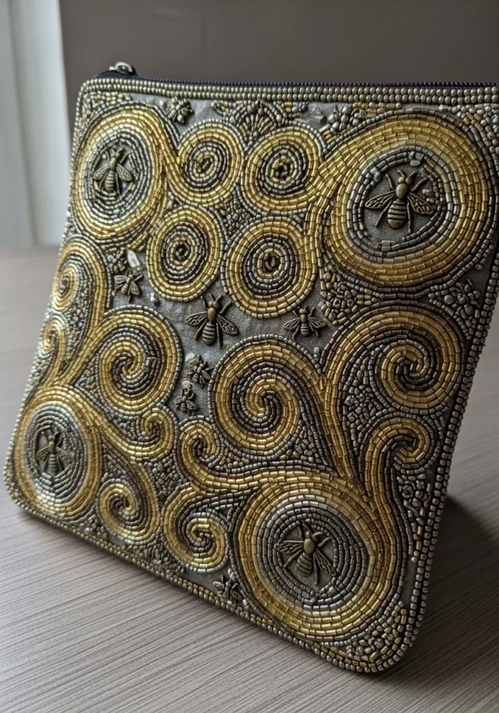 I absolutely love how this clutch feels both bold and timeless. The swirling patterns draw your eye in, and then you notice the little bees tucked into the design, which makes it even more special. If you enjoy detailed hand stitching and playing with metallic beads, this is such a rewarding project to try. Building those spirals bead by bead feels almost meditative, and the final result looks like a true statement accessory that you would be proud to carry anywhere.