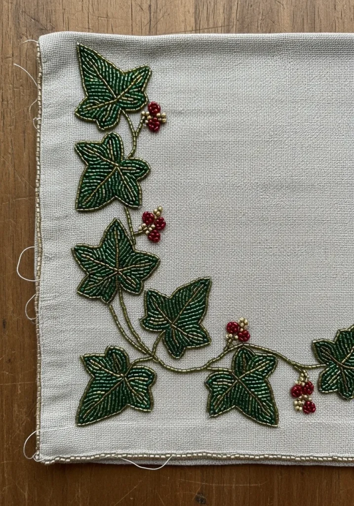 This elegant hand beaded fabric panel is stitched on natural linen and adorned with a graceful ivy vine that curves along the corner. Each leaf is filled with deep green seed beads arranged in neat rows that highlight the vein details, while slender gold beads outline the shapes and stems. Clusters of glossy red beads form tiny berries that pop beautifully against the soft neutral background. The mix of matte linen and shimmering beadwork creates a lovely contrast that feels organic yet refined.