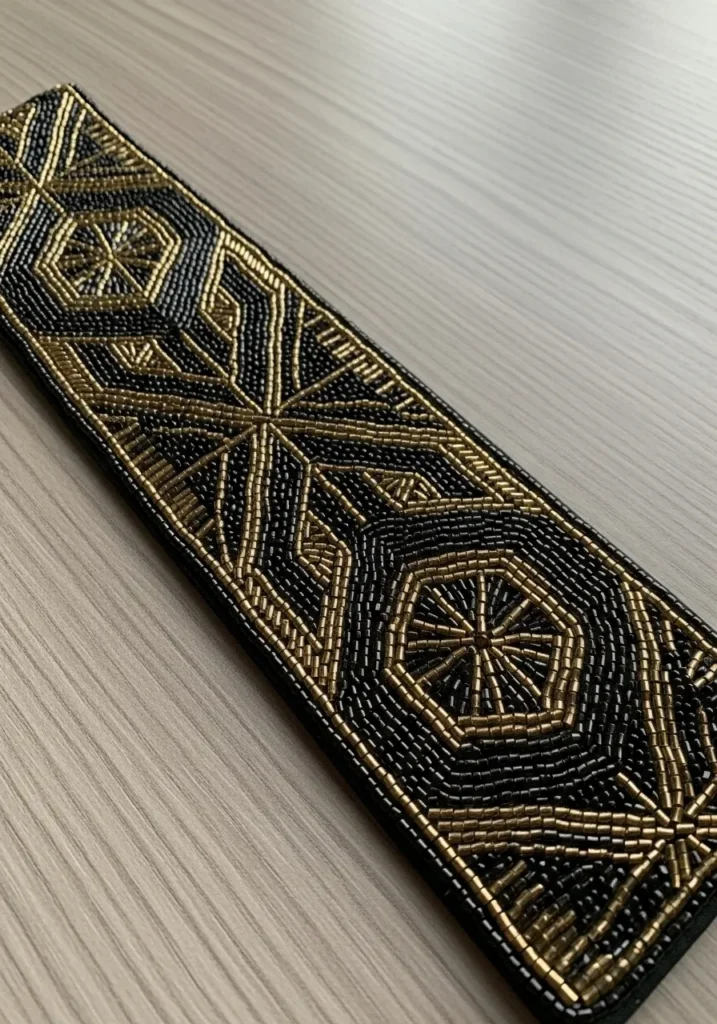 This elegant hand beaded fabric belt panel features a bold Art Deco inspired design stitched on a deep black base. Intricate geometric patterns unfold in rich gold and bronze seed beads, forming starbursts, hexagons, and sharp angular lines that feel beautifully structured. The beads are arranged in tight rows that create a slightly raised texture, giving the piece depth and a subtle metallic shimmer. The contrast between the dark background and warm gold tones makes the design feel dramatic yet timeless.