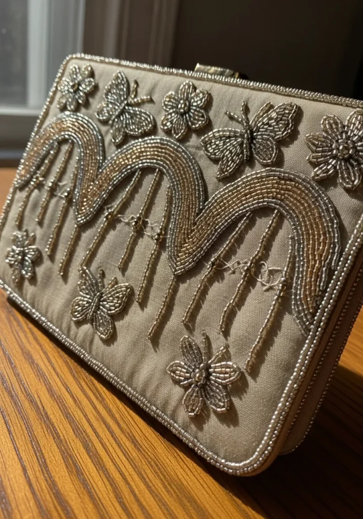 This elegant hand beaded fabric clutch is stitched on a soft champagne base and decorated with sweeping rainbow arcs formed from rows of metallic gold and silver beads. Delicate bead strands cascade downward from the arches, creating a graceful draped effect that adds movement and texture. Scattered butterflies and floral motifs are carefully outlined and filled with shimmering seed beads, giving the surface a layered, dimensional look. The neat beaded trim around the edges frames the design beautifully and gives the clutch a polished finish.