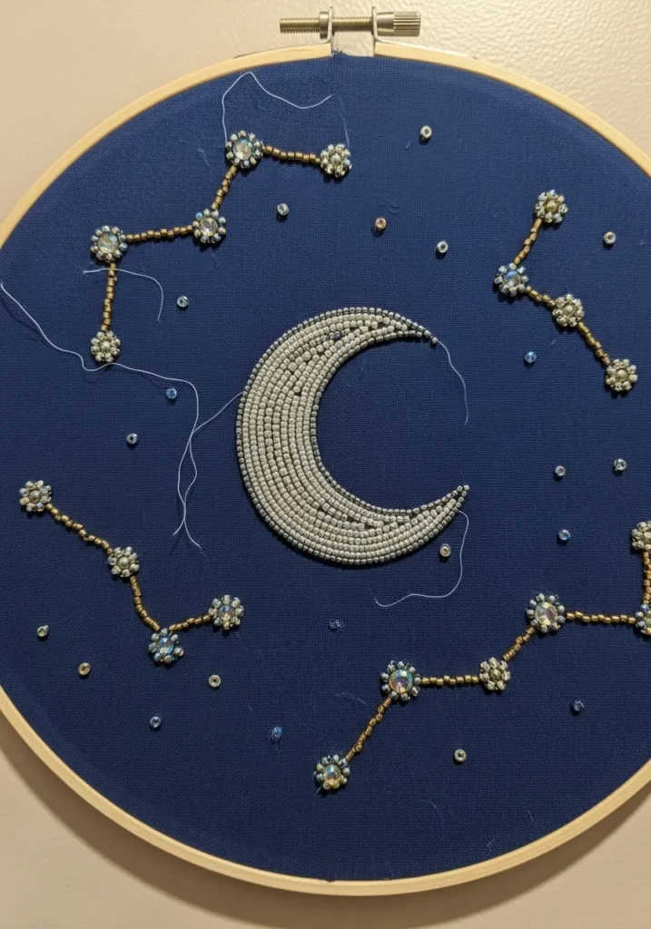 This elegant hand beaded fabric hoop showcases a deep navy background that instantly feels like a night sky. At the center, a crescent moon is carefully formed with rows of soft silver beads, creating a smooth curved silhouette with subtle texture. Surrounding the moon are delicate constellation patterns stitched with tiny gold beads and clustered crystal like accents that resemble glowing stars. Scattered single beads across the fabric add extra sparkle and dimension, all framed neatly inside a simple wooden embroidery hoop.