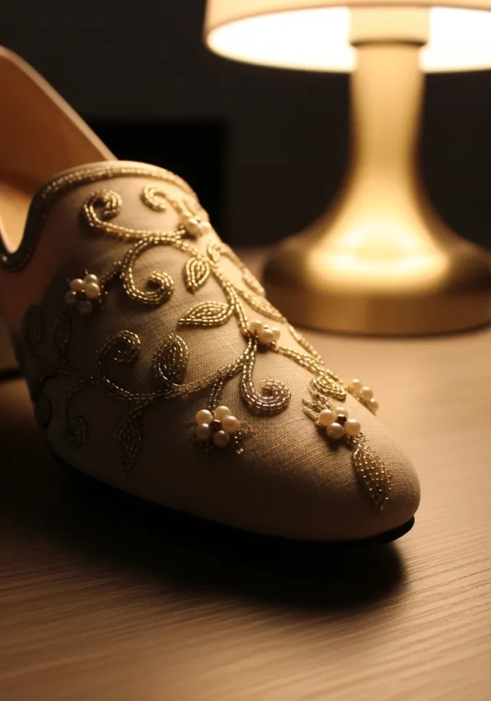This elegant hand beaded fabric shoe features a soft nude textile base adorned with delicate swirling vines stitched in gold and champagne seed beads. Small leaf motifs branch outward in neat curved lines, while tiny pearl clusters form subtle blossoms across the surface. The beadwork adds a gentle raised texture that catches the warm light beautifully, giving the shoe a refined glow. The overall design feels romantic and vintage inspired, with a balanced mix of shimmer and softness.