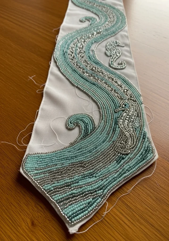 This elegant hand beaded fabric panel features a flowing ocean wave design stitched in soft aqua, seafoam, and silver beads on a light satin base. Rows of tiny seed beads curve gracefully to form the cresting wave, creating beautiful movement and texture across the fabric. A delicate seahorse shape emerges along the swell, outlined in shimmering silver beads that catch the light. The layered beadwork gives the water a sense of depth, almost as if it is gently rolling across the surface.