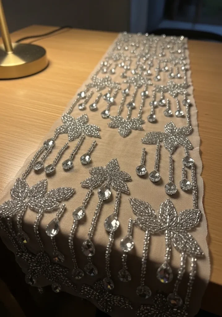 This elegant hand beaded fabric table runner features a soft beige base adorned with shimmering silver seed beads and faceted crystal drops. Delicate floral motifs are stitched in intricate clusters, with each flower leading into cascading strands of beads that end in teardrop shaped gems. The design creates a graceful draped effect along the edges, almost like sparkling fringe made entirely of beads. The mix of tiny metallic beads and larger clear crystals adds rich texture and a beautiful play of light across the fabric.
