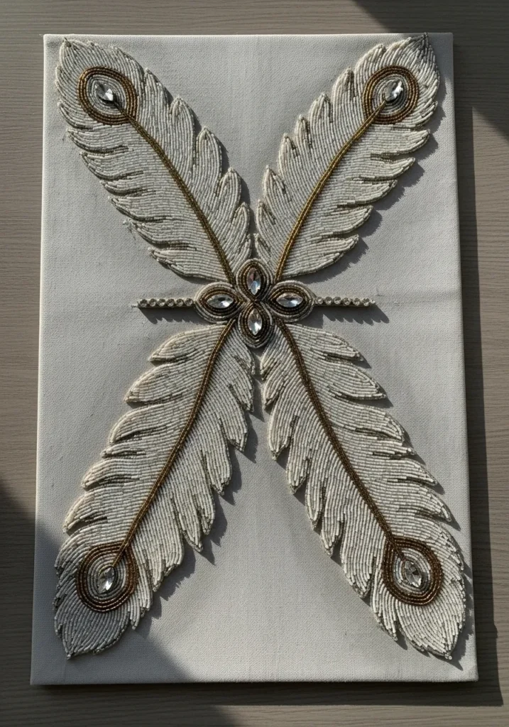This elegant hand beaded fabric wall panel features a striking symmetrical feather design stitched on a soft neutral canvas. Four flowing feather forms extend outward, each built from rows of creamy white seed beads that create a soft layered texture. Slim gold bead lines trace through the center of each feather, guiding the eye toward faceted crystal accents that sit like dewdrops at the tips and center. The balance of matte fabric, shimmering beads, and reflective crystals gives the piece a light and ethereal feel.
