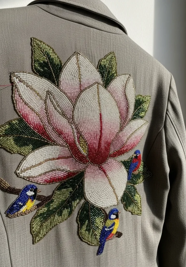 This stunning hand beaded design transforms the back of a neutral tailored jacket into a wearable work of art. A large magnolia flower blooms across the fabric, built from tiny ivory and blush seed beads that softly blend from pale pink to deep rose near the center. Rich green beaded leaves frame the petals, each outlined with fine gold beads for definition. Three vibrant blue and yellow birds perch along delicate branches, adding a playful pop of color and contrast against the muted background. The texture is beautifully raised, with layered beadwork that catches the light from every angle.