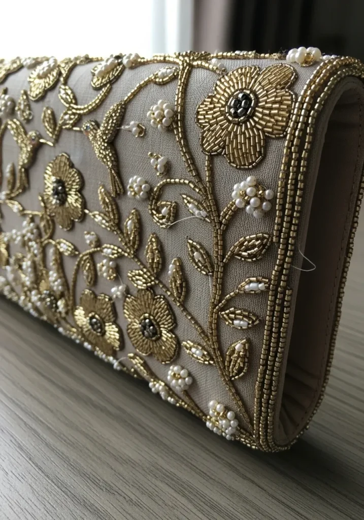 This elegant hand beaded fabric clutch features a soft champagne linen base richly adorned with gold seed beads and tiny ivory pearls. Intricate floral motifs bloom across the surface, with layered petals formed from slender bugle beads and rounded seed beads that catch the light beautifully. Delicate vine scrolls frame the design, creating a balanced and timeless pattern from edge to edge. The structured silhouette of the clutch adds a refined touch, while the textured beadwork gives it depth and a subtle shimmer that feels both classic and luxurious.