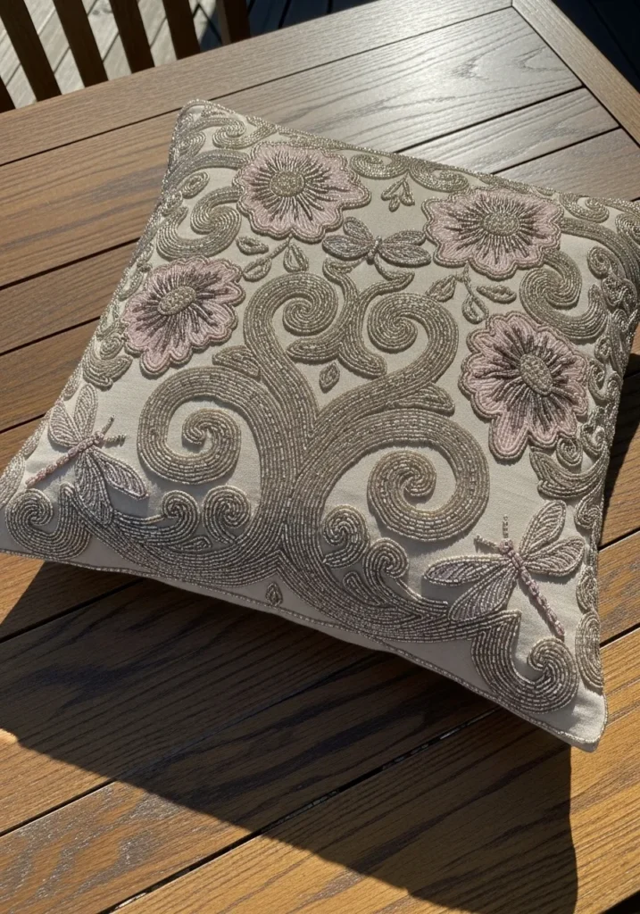 This elegant hand beaded fabric cushion features a soft ivory base richly decorated with swirling silver beadwork and raised blush floral motifs. Tiny seed beads trace graceful scroll patterns that flow across the surface like vines, while layered flowers in dusty pink tones add gentle dimension. Delicate dragonflies rest among the curves, stitched with fine beads that give their wings a subtle shimmer. The mix of matte fabric and glossy beads creates beautiful texture, making the whole design feel refined yet inviting.