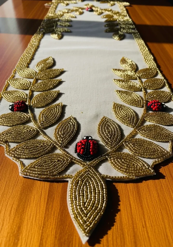 This elegant hand beaded fabric runner is stitched on a soft ivory base and framed with symmetrical laurel branches made from rows of shimmering gold seed beads. Each leaf is carefully outlined and filled to create a raised, textured surface that catches the light beautifully. Bright red and black beaded ladybugs are nestled along the branches, adding a bold pop of color against the warm metallic tones. The pointed leaf detail at the end gives the runner a refined finish and enhances its classic, almost royal look.