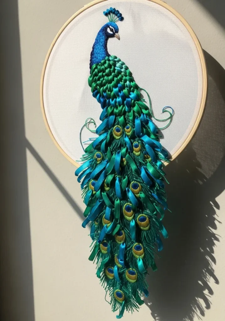This elegant ribbon embroidery design features a majestic peacock stitched inside a wooden hoop. Shades of teal, emerald, and deep blue satin ribbons are layered to create a cascading tail full of texture and movement. Each feather is shaped with careful folds and small stitched accents that mimic the classic eye pattern. The smooth fabric background keeps the focus on the rich, dimensional ribbon work, making the colors look even more vibrant.