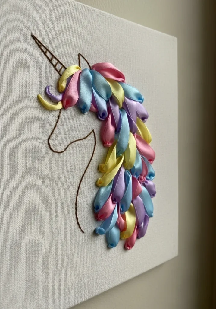 This playful ribbon embroidery artwork features a unicorn profile adorned with flowing pastel mane strands. Soft ribbons in pink, mint, lavender, and buttery yellow cascade down in layered folds, creating a lush and textured mane. The unicorn’s face and horn are carefully stitched with fine thread, giving structure to the dreamy ribbon details. The raised mane adds beautiful dimension against the simple fabric base.