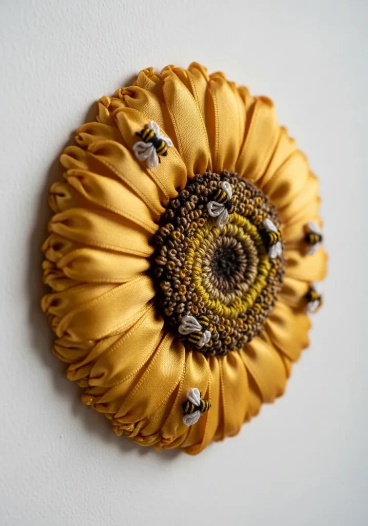This radiant ribbon embroidery piece features a large sunflower crafted from rich golden satin ribbons. The petals are folded and layered to create a full, dimensional bloom that almost lifts off the fabric. The center is densely stitched with textured brown and deep amber thread, adding contrast and depth. Tiny embroidered bees bring a charming detail, while the clean neutral background keeps the focus on the bold flower.