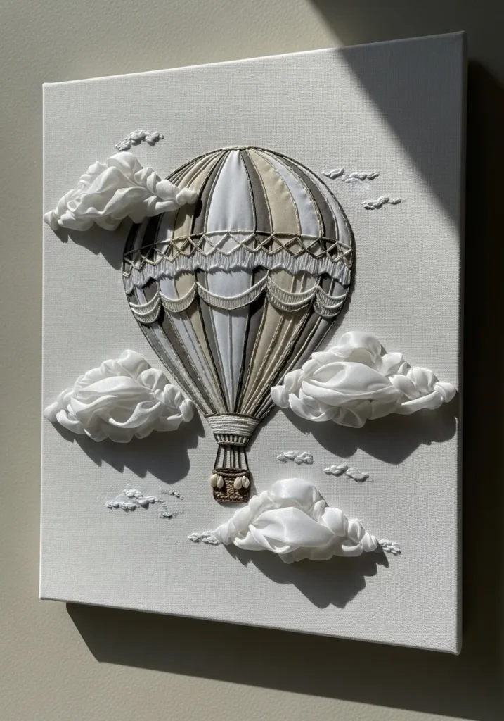 This dreamy design showcases a vintage style hot air balloon floating among soft ribbon clouds. The balloon is formed with ivory and muted beige ribbons arranged in neat vertical segments, creating subtle texture and dimension. Puffy white ribbon clouds surround it, layered to look airy and soft. The square fabric panel gives the whole scene a clean and modern presentation.