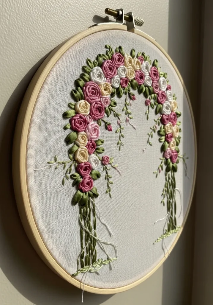 I adore how timeless this design feels. Crafting ribbon roses is always a little magical to me because each bloom turns out slightly unique. Watching the arch take shape stitch by stitch is so rewarding. It feels like creating a miniature garden that will never fade.