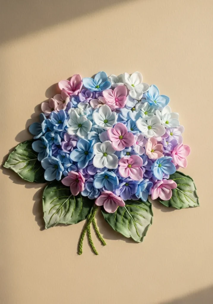 I think hydrangeas are perfect for ribbon embroidery because their layered petals create such natural volume. The repetitive shaping of the tiny petals is surprisingly relaxing. It is a wonderful project for anyone who enjoys detailed work that slowly builds into something beautifully full.
