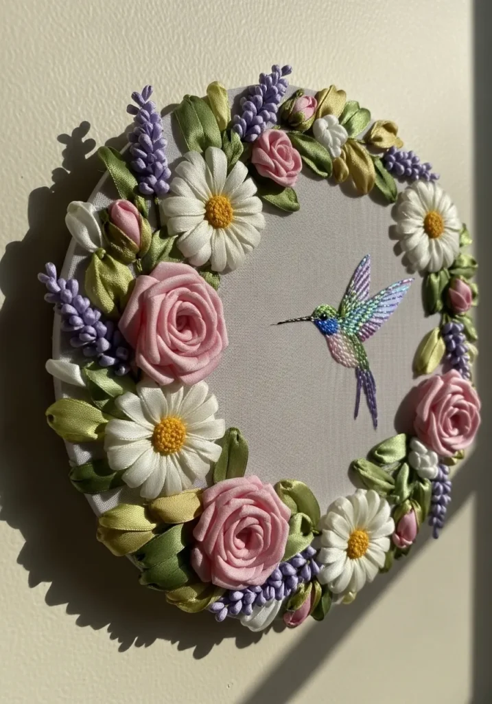 This circular ribbon embroidery wreath is bursting with soft florals and delicate detail. Blush pink ribbon roses sit beside creamy white daisies, lavender sprigs, and lush green leaves, all carefully shaped from satin ribbons. In the center, a tiny embroidered hummingbird adds a whimsical touch, stitched in soft greens and blues. The raised petals and layered leaves create a full, textured wreath that almost looks three dimensional against the neutral fabric base.