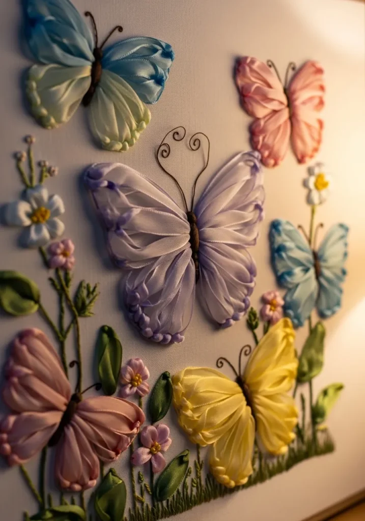 Pastel Butterfly Ribbon Embroidery Wall Art