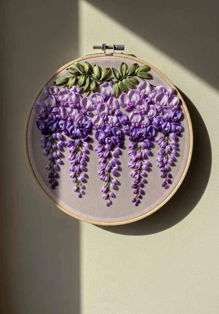 This dreamy hoop design features cascading wisteria blooms crafted from soft purple satin ribbons. Clusters of lilac and lavender petals hang gracefully from embroidered green stems, creating a natural flowing effect. The leaves are formed with layered ribbon stitches, giving them a slightly raised and realistic look. Set against a neutral fabric in a simple wooden hoop, the delicate purple tones feel elegant and calming.