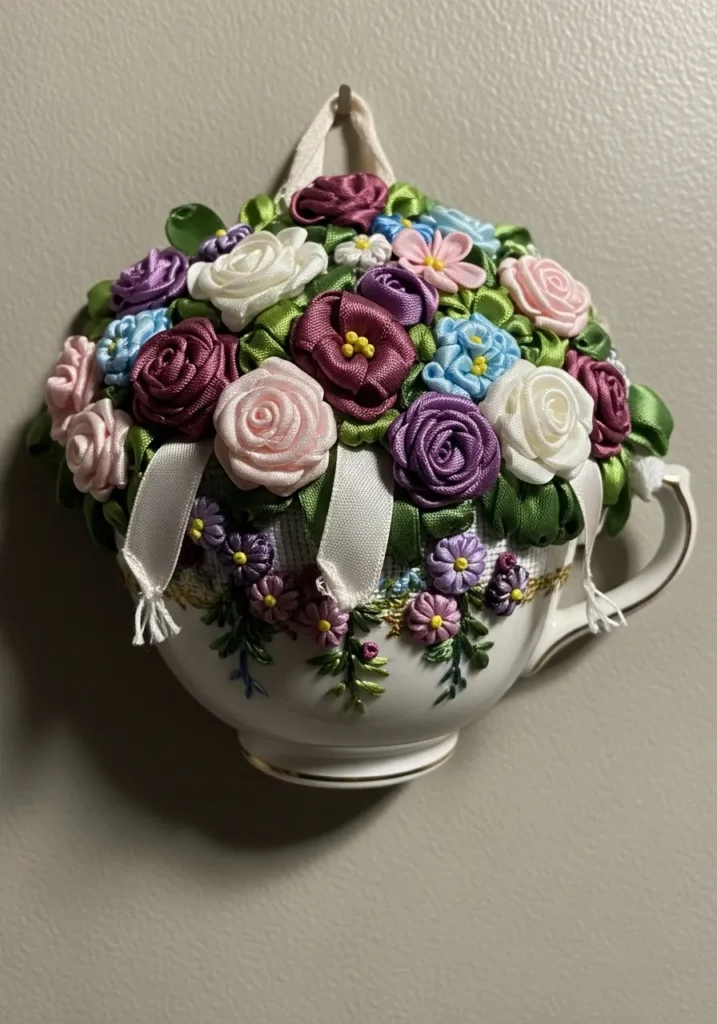 This charming ribbon embroidery piece features a classic teacup overflowing with lush ribbon roses and blossoms. Soft pinks, purples, and creamy whites are layered to create full dimensional flowers, while green ribbon leaves peek out between the blooms. The teacup itself is carefully embroidered with fine thread details, giving the illusion of porcelain. The raised floral textures make the arrangement look almost real.