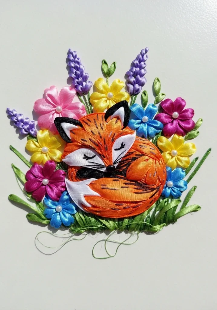 This sweet ribbon embroidery design features a curled up fox nestled among vibrant flowers. The fox is crafted with warm orange and rust toned ribbons layered to create soft fur texture, while tiny stitched details define the eyes and delicate whiskers. Surrounding the fox are bright blooms in pink, yellow, purple, and blue, all shaped from satin ribbons with gently folded petals and lush green leaves. The neutral fabric background allows the colorful bouquet to pop beautifully.