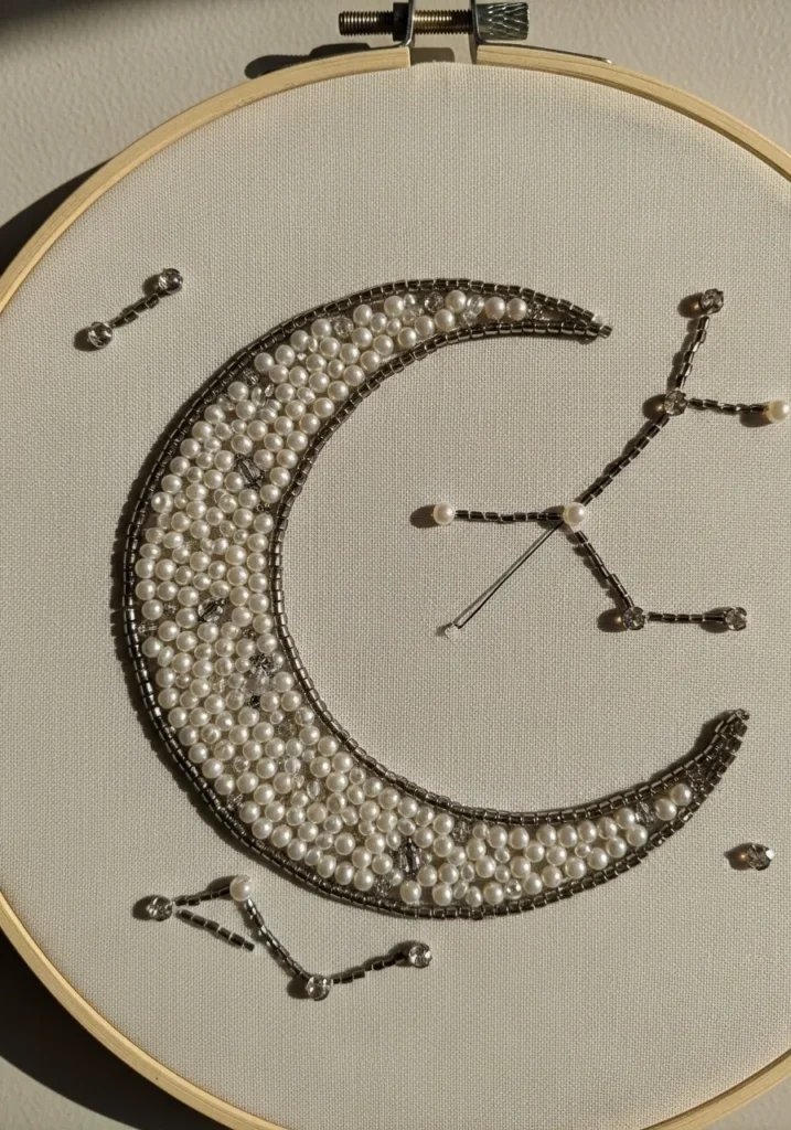This bead embroidery hoop features a stunning crescent moon filled with creamy pearl beads in varying sizes, creating a rich, dimensional surface that almost glows. The moon is outlined with metallic seed beads that add a sleek contrast and define its elegant curve. Scattered crystal beads catch the light like tiny stars, while delicate stitched constellation lines add a subtle celestial touch. The neutral fabric background keeps everything soft and dreamy, allowing the beadwork texture and shimmer to truly stand out.