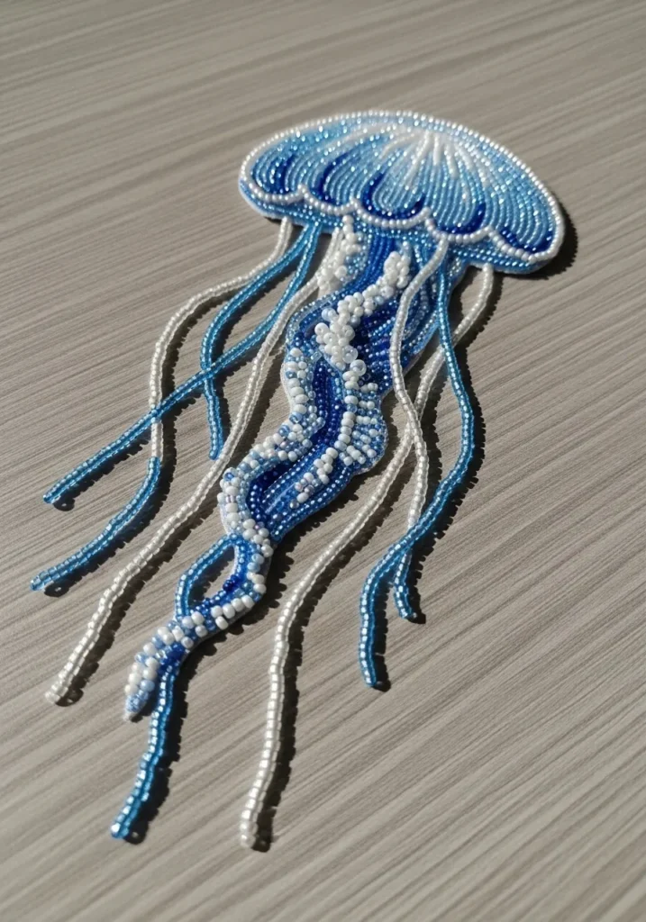 I cannot resist a coastal inspired piece like this. It feels playful and a little bit fancy at the same time. If you love ocean themes, this is such a satisfying project to try because you can work on one arm at a time. It looks detailed, but the repeating shape makes it surprisingly manageable. I would happily pin this onto a summer tote or denim jacket for a pop of seaside sparkle.