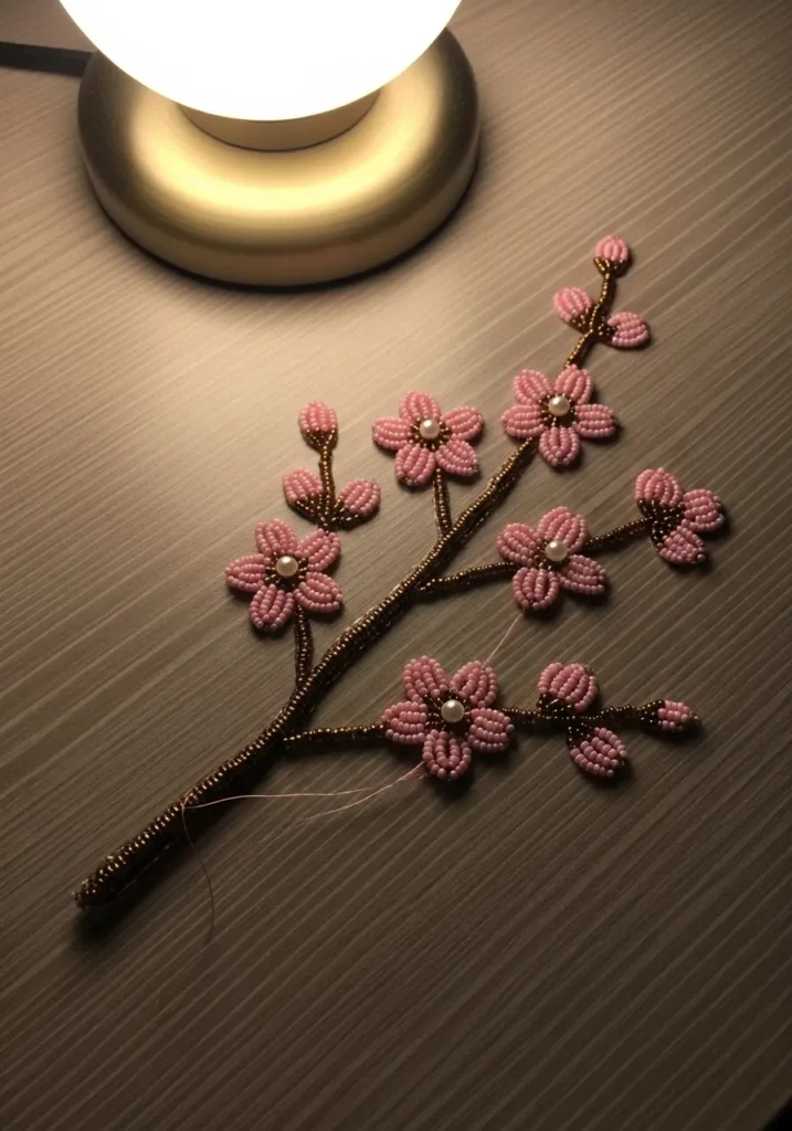 This bead embroidery design features a delicate cherry blossom branch stitched in warm brown seed beads that form a gently curving stem. Soft pink beads create each tiny flower, arranged in rounded petals with creamy pearl beads at the centers for a subtle glow. Small budding blossoms extend from the branch tips, adding a sense of natural growth and movement. The contrast between the earthy stem and the blush petals gives the piece a balanced, elegant look that feels both refined and handmade.
