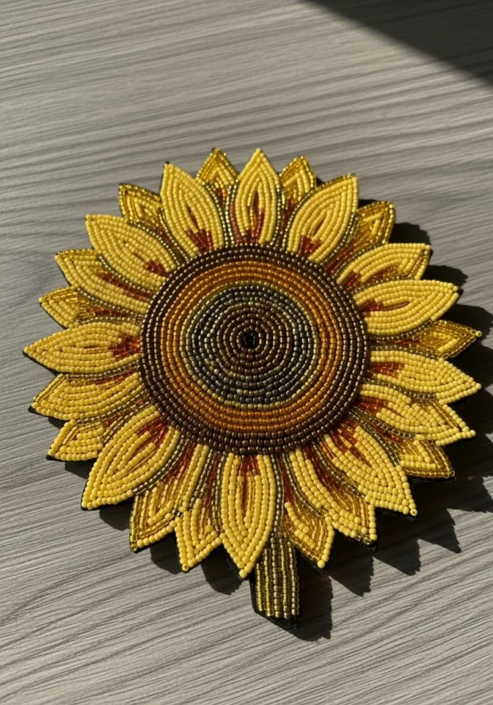 I love how cheerful this piece feels the second you look at it. Sunflowers just have that happy energy, and recreating one in beads makes it extra special. It looks intricate, but you can build it petal by petal, which makes it surprisingly manageable. If you’re into nature inspired designs that still feel bold and eye catching, this is such a fun project to try. I can totally see this turned into a brooch, a bag patch, or even framed on a hoop for sunny wall decor.