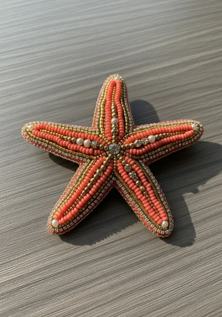 • Coral Starfish Bead Embroidery Brooch