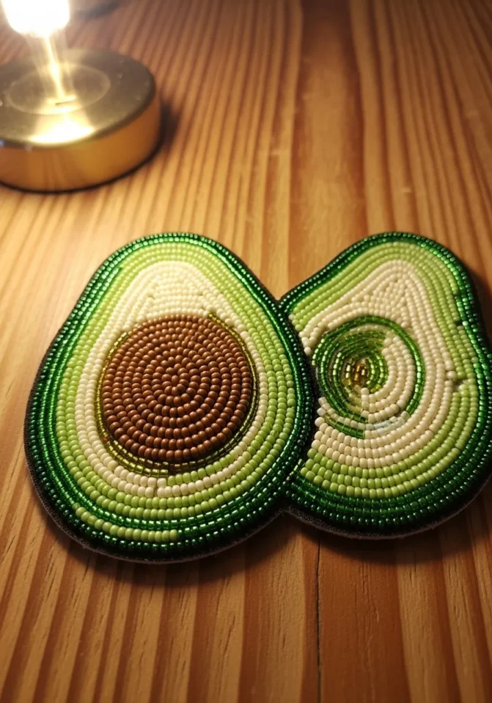 This playful bead embroidery applique is shaped like a sliced avocado, complete with one half showing a textured brown pit and the other revealing a soft green center. Concentric rows of tiny seed beads in shades of deep forest green, bright lime, and creamy ivory create that smooth color transition you see in a real avocado. The pit is stitched in tight circular rows of warm brown beads, giving it a raised, almost three dimensional look. A darker green outline frames the whole shape, making it pop beautifully against fabric.