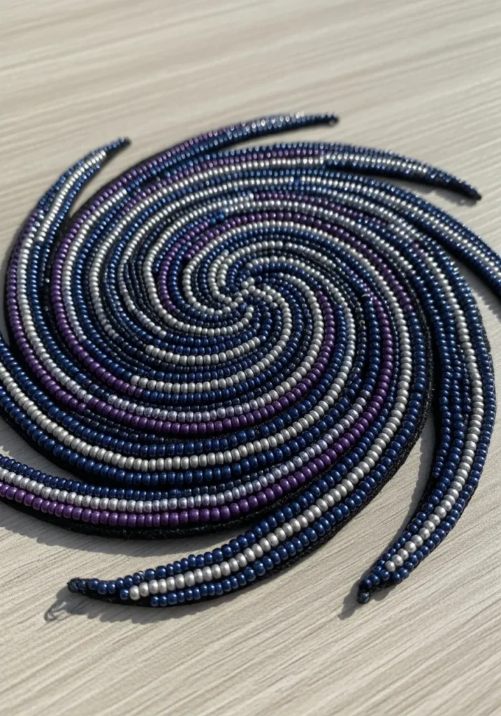 This bead embroidery design forms a dramatic swirling spiral that feels like a tiny galaxy stitched by hand. Rows of seed beads in deep navy, midnight blue, smoky gray, and rich purple curve inward in a hypnotic pattern. The beads are arranged in tight, flowing lines that create beautiful movement and texture, almost like a whirlpool of stars. A dark base peeks subtly underneath, giving the whole piece depth and making the cool tones stand out even more.