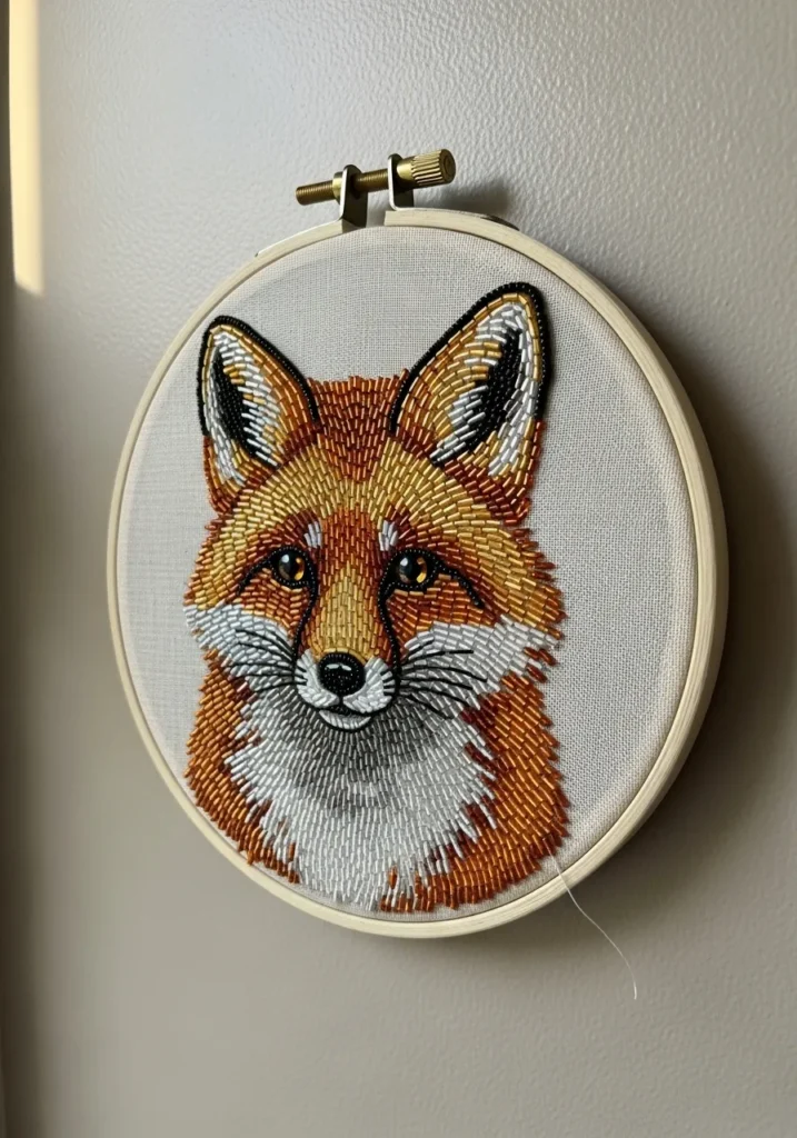 • Realistic Fox Bead Embroidery Hoop Portrait