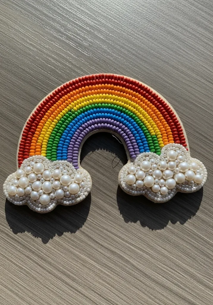 This bead embroidery brooch features a bright rainbow stitched in neat rows of tiny seed beads in red, orange, yellow, green, blue, and purple. Each arc is carefully layered to create a smooth curve and bold color contrast. At both ends, fluffy cloud shapes are filled with creamy pearl beads in different sizes, giving the design a soft, dimensional finish. A delicate beaded outline frames the entire piece, keeping the edges crisp while still feeling sweet and handmade.