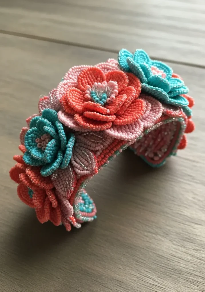 I love projects like this because they feel extra special but are totally doable if you take your time. Stitching petal by petal is oddly relaxing, and watching the flowers build up layer by layer is so satisfying. If you’re into colorful statement pieces, this kind of cuff lets you play with bold palettes and dramatic shapes without needing complicated techniques. It is the kind of bracelet that instantly makes an outfit feel cheerful and creative, and honestly, who does not want to wear a little garden on her arm.