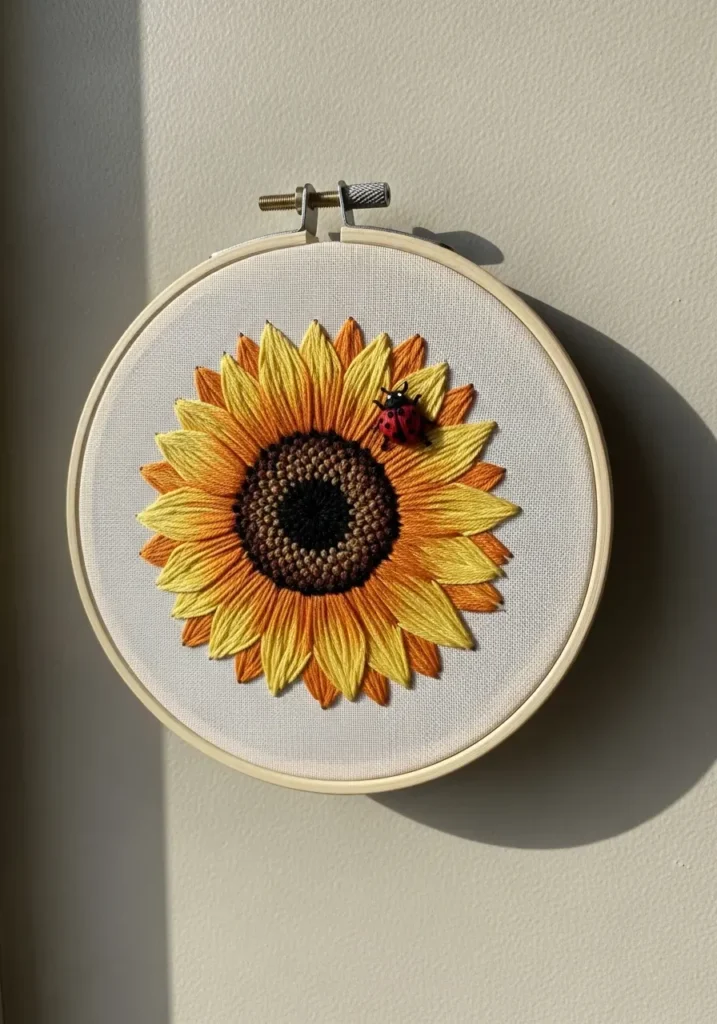 This embroidery hoop showcases a large, detailed sunflower stitched onto light fabric. Rich golden yellow petals surround a deep brown center filled with tiny textured stitches. The layers of thread give the petals a slightly dimensional look, making the flower feel full and lively. The simple background keeps all the attention on the bold bloom.