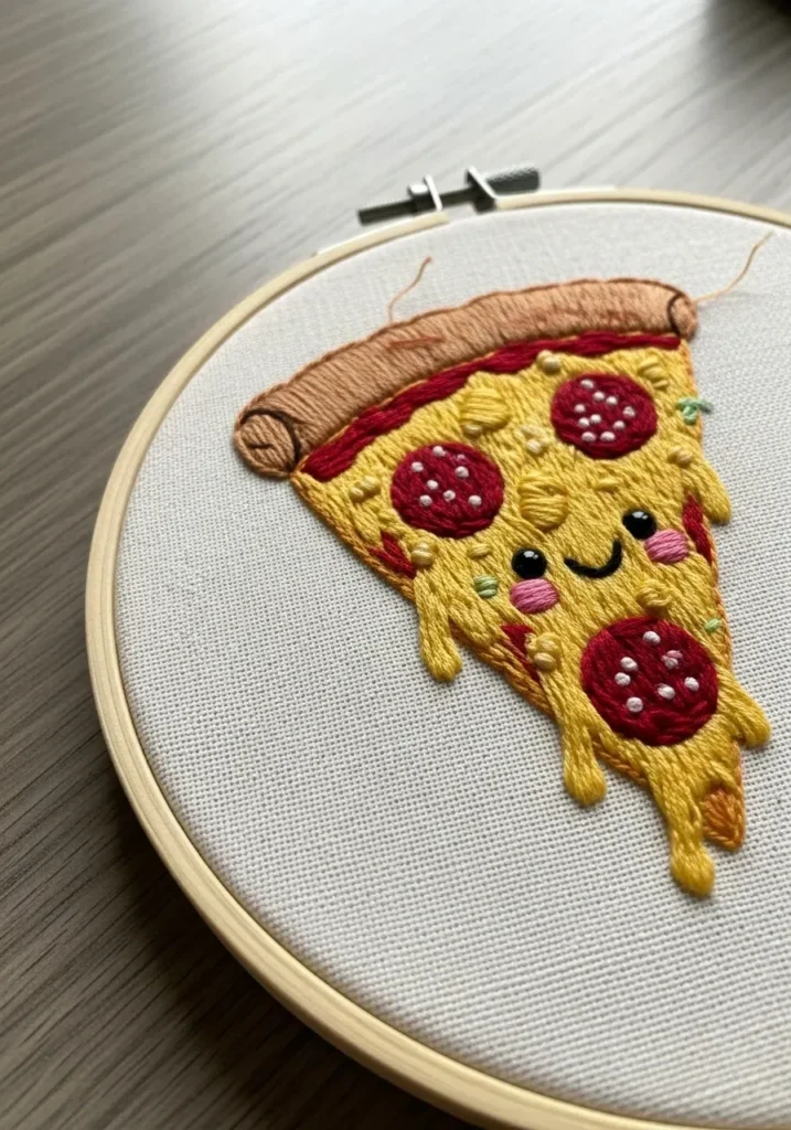 Food themed embroidery always makes me smile. It feels unexpected and fun compared to classic florals. If you want a project that sparks conversation and adds personality to your craft corner, this cute pizza slice is a deliciously creative idea.