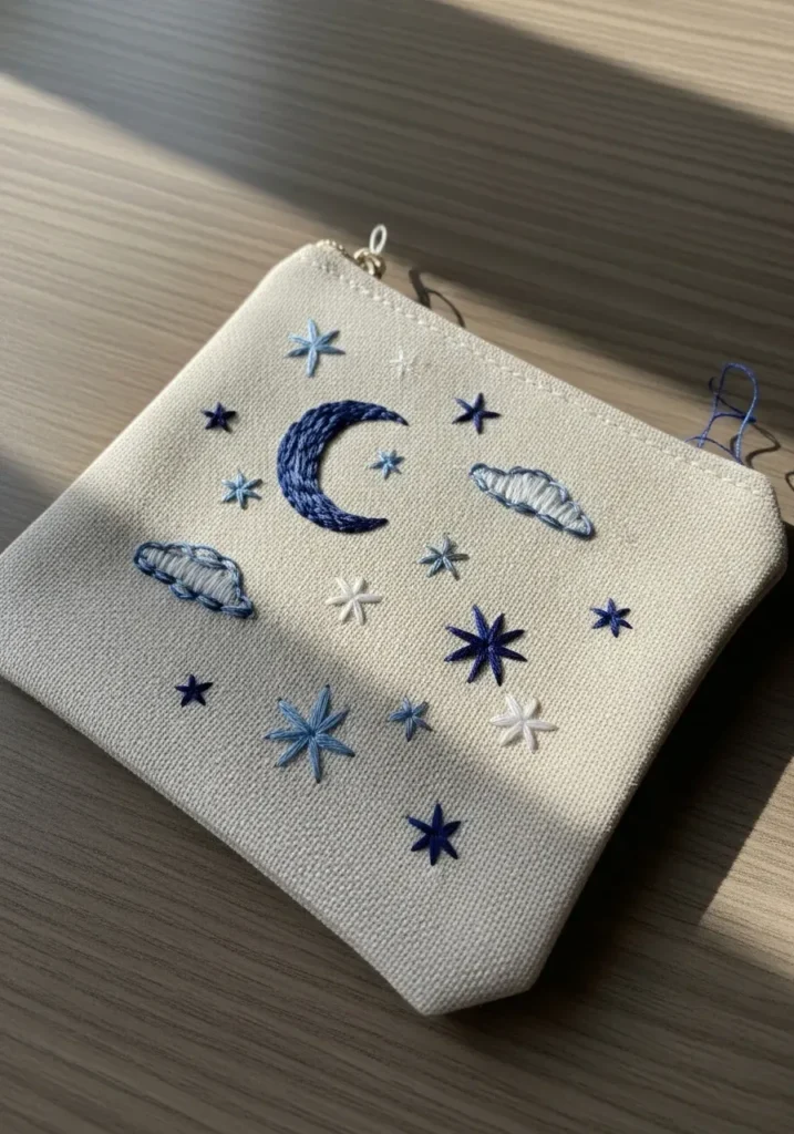 I love projects that turn everyday items into something magical. A simple pouch becomes so much more special with a little stitched moon and stars. This kind of design feels relaxing to work on, especially when I am in the mood for something calm and soothing.