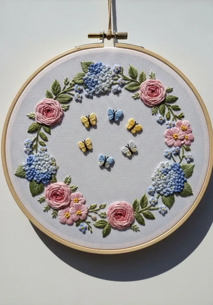 This embroidery hoop showcases a circular wreath made of pink roses, blue hydrangea style blooms, and soft green leaves stitched onto neutral fabric. Tiny yellow accents sit in the center, adding a sweet focal point. The layered petals and textured leaves give the wreath a rich, dimensional feel that looks beautifully detailed without feeling overwhelming. The balanced circular layout makes it look polished and elegant.
