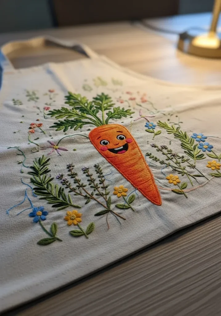 I adore embroidery that feels a little quirky and unexpected. A happy carrot on a tote bag is such a fun twist on traditional florals. It makes grocery runs feel more personal and creative, which is always a win in my book.
