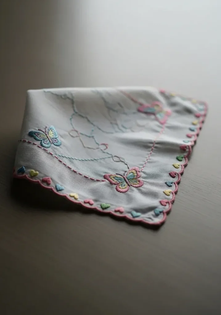 This light fabric handkerchief features small embroidered butterflies fluttering near one corner, with soft pastel wings and fine stitched outlines. A scalloped edge in coordinating thread adds an extra feminine touch. The design is subtle and airy, letting the delicate details shine without overpowering the fabric. The texture is light and smooth, making it feel elegant and timeless.