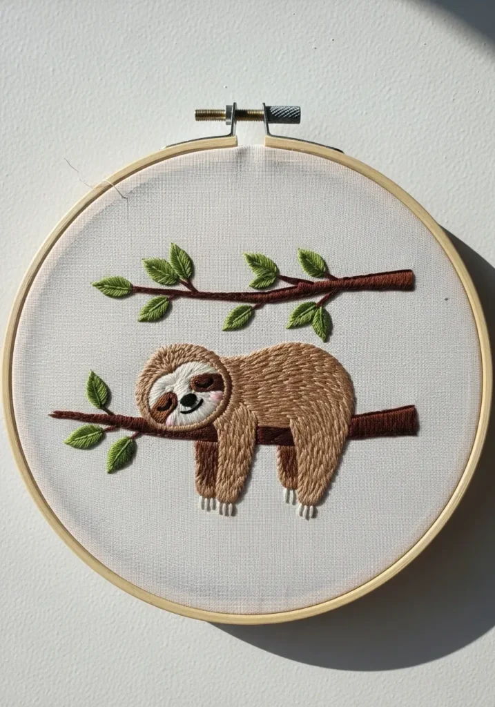 This embroidery hoop features an adorable sloth hanging from a stitched branch with small green leaves. The sloth is created with soft brown threads and subtle shading to bring out its gentle expression. The branch stretches across the hoop, grounding the design and adding balance. The textures in the fur and leaves make the piece feel warm and slightly three dimensional.