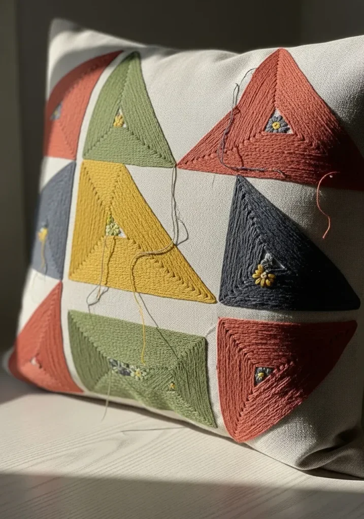 This decorative pillow features a bold geometric design made up of stitched triangle shapes in warm mustard, muted green, soft coral, and deep navy. Each section is outlined with clean embroidery lines and accented with tiny stitched details that add texture and interest. The fabric base is neutral, allowing the earthy color palette to stand out without feeling overwhelming. The overall look feels modern yet cozy, like a handmade twist on classic patchwork.