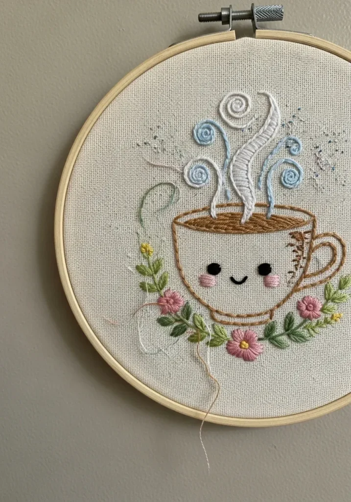 This adorable embroidery hoop shows a smiling coffee cup with soft steam swirling above it in pale blue thread. The cup is stitched in warm beige tones, surrounded by tiny pink flowers and green leaves at the base. The steam is created with light, airy stitches that give the design a playful sense of movement. The neutral fabric background keeps everything feeling soft and cozy.