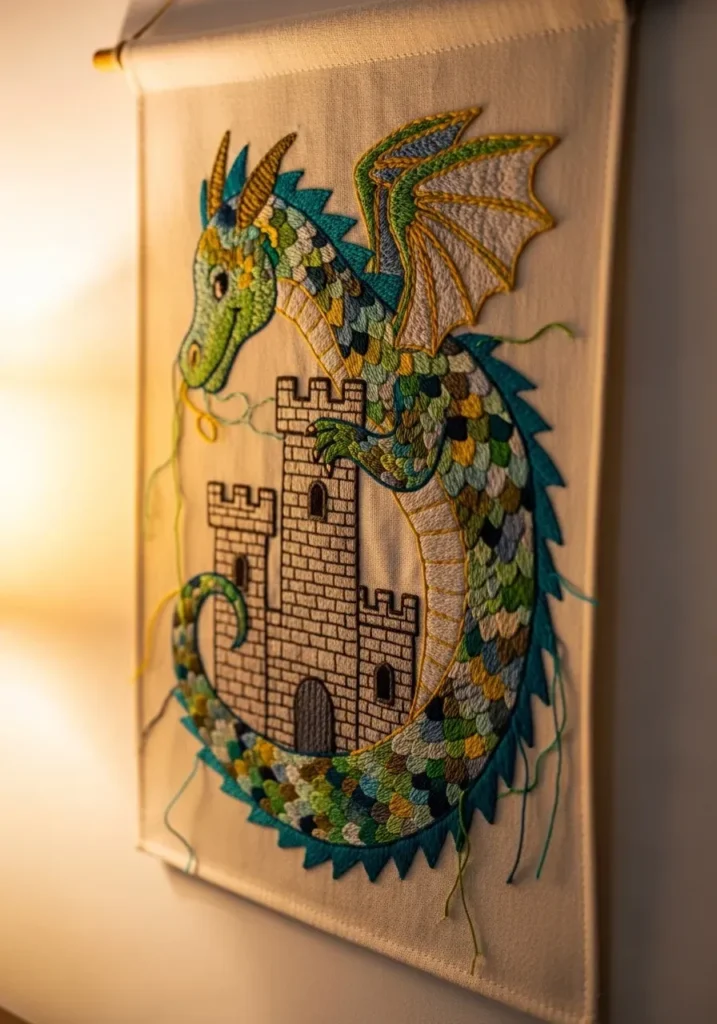 I think fantasy inspired embroidery is such a creative escape. It allows me to play with bold colors and intricate details in a way that feels imaginative and exciting. If you enjoy storytelling through crafts, a dragon scene like this turns a simple hoop into a magical little artwork.