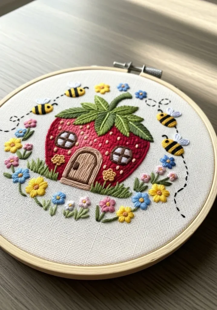 This charming embroidery hoop showcases a tiny cottage shaped like a strawberry, surrounded by small yellow flowers and buzzing bees. The cottage is stitched in bright red with textured seeds and leafy green details at the top. The bees are tiny but full of personality, and the surrounding flowers add pops of color around the scene. The design feels whimsical and detailed without being too busy.
