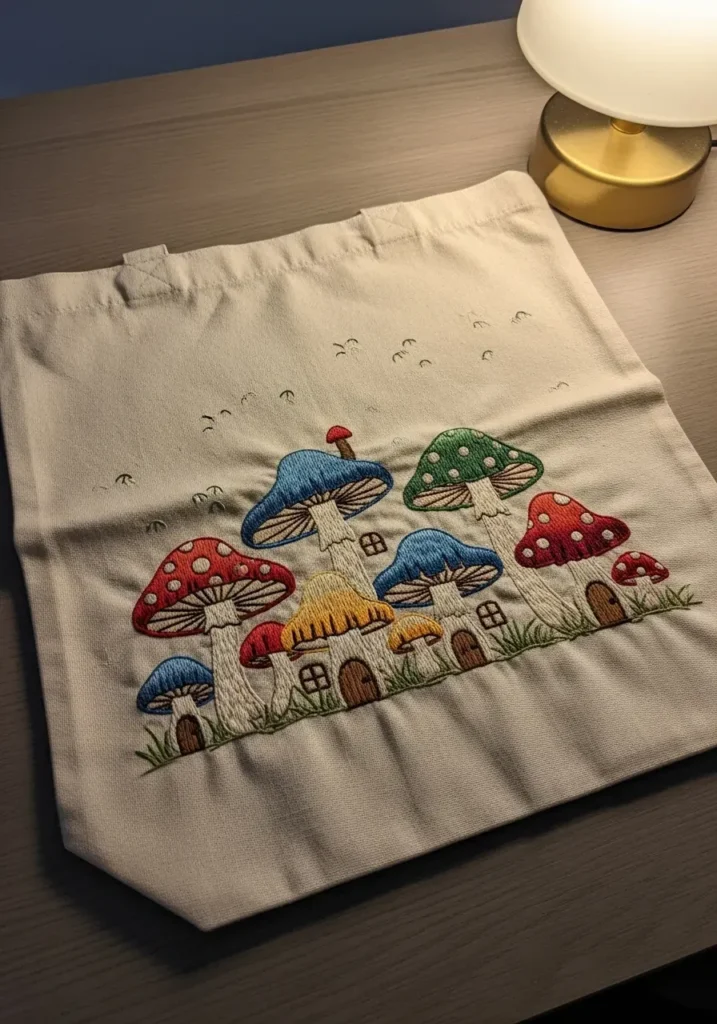This embroidered tote bag features a charming row of colorful mushrooms stitched across natural canvas fabric. Red, blue, and beige mushroom caps pop against the soft neutral base, with tiny stitched details adding personality to each one. The threads create a slightly textured, storybook feel that makes the design feel cozy and playful. The simple fabric tote keeps the focus on the embroidery itself.