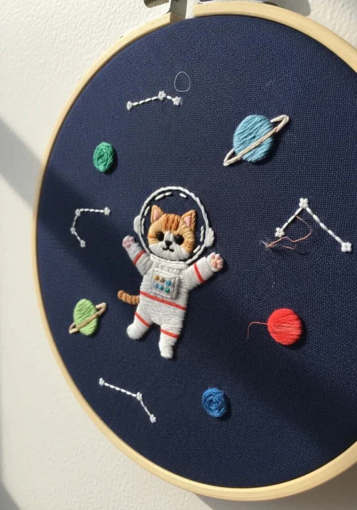 This fun embroidery hoop shows an adorable little animal dressed in a tiny astronaut suit, floating among stitched planets and constellations on deep navy fabric. The bright blues, reds, and greens of the planets stand out beautifully against the dark background. Small stitched stars and simple constellation lines add movement and detail. The textures vary from smooth satin stitches to tiny knot stitches for stars, giving the piece playful dimension.