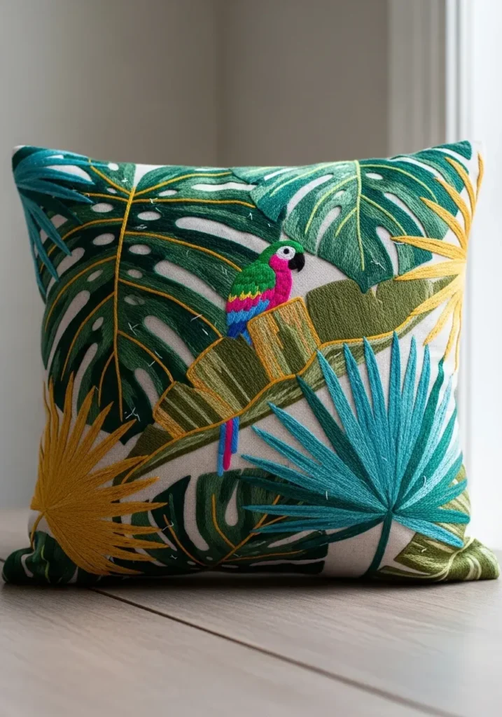 I love embroidery that goes beyond hoops and turns into home decor. Adding stitched details to a pillow makes a space feel instantly more personal. If you enjoy vibrant colors and statement pieces, this tropical design is such a joyful project to try.