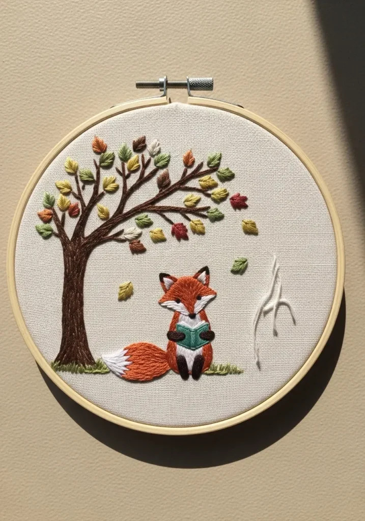 This sweet embroidery hoop features a small fox sitting under a tree filled with tiny stitched leaves. Warm orange tones bring the fox to life, while soft greens and browns create a gentle woodland scene. The neutral fabric background keeps everything feeling earthy and balanced. Small details like individual leaves and subtle shading in the fur add texture and charm.